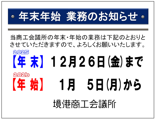 境港商工会議所の年末・年始業務は、以下のとおりです。